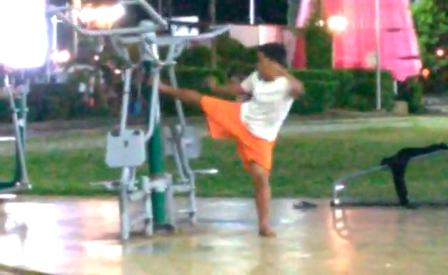 Dimana dalam video yang berdurasi hampir satu menit yang diambil seseorang, terlihat pria yang memakai kaus berwarna putih dan celana pendek oranye, menendang-nendang alat fitnes yang sering dipakai masyarakat berolahraga.