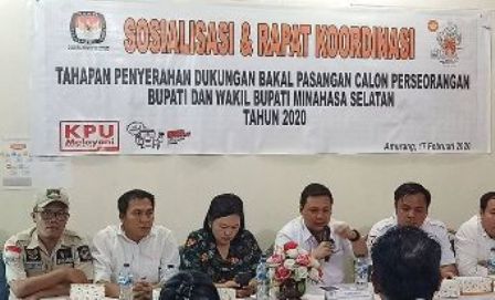 AMURANG, BERITASULUT.co.id – Komisi Pemilihan Umum (KPU) Kabupaten Minahasa Selatan (Minsel) menggelar Sosialisasi dan Rapat Koordinasi (Rakor) Tahapan Penyerahan Dukungan Bakal Pasangan Calon (Paslon) Perseorangan Bupati dan Wakil Bupati Minsel Tahun 2020, Senin (17/02/2020).