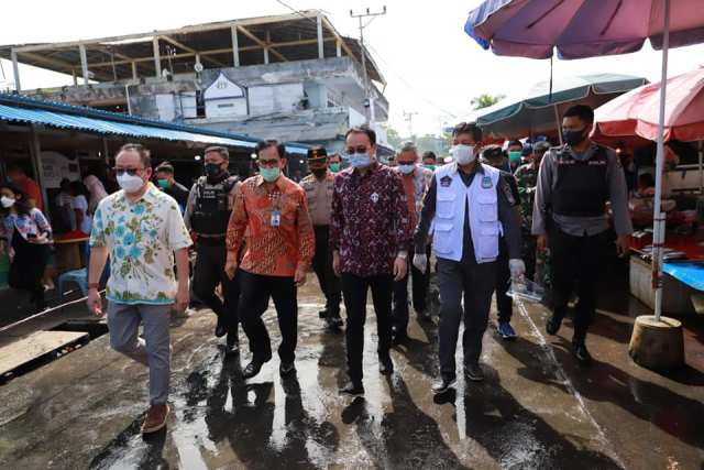 MANADO, BERITASULUT.co.id – Walikota Manado Dr GS Vicky Lumentut (GSVL) dan Wakil Menteri Perdagangan (Wamendag) Dr Jerry Sambuaga, bersama Kepala Bank Indonesia Perwakilan Sulut Arbonas Hutanarat, Presiden Direktur OVO Karaniya Dharmasaputera, mengunjungi pasar tradisional Bersehati, Kelurahan Calaca, Kecamatan Wenang, Jumat (02/10/2020) pagi.