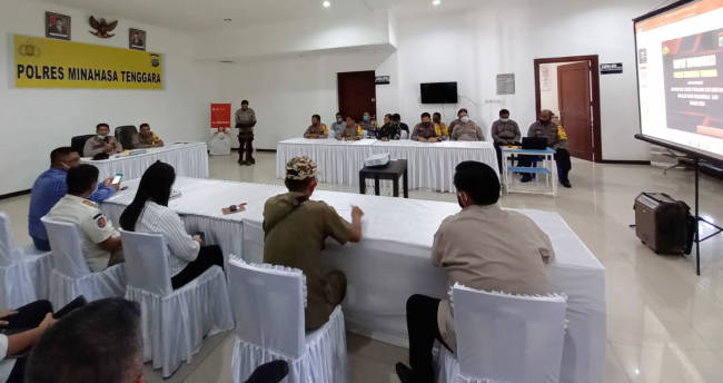 RATAHAN, BERITASULUT.co.id – Perdana melaksanakan tugas sebagai Kapolres di Minahasa Tenggara (Mitra), AKBP Rudi Hartono langsung menggelar rapat koordinasi (Rakor) bersama dengan Dinas Kesehatan, Badan Penanggulangan Bencana Daerah (BPBD), Satuan Polisi Pamong Praja (Sat Pol-PP), pejabat utama Polres dan para Kapolsek, Selasa (27/10/2020) di ruang rapat Polres Mitra.