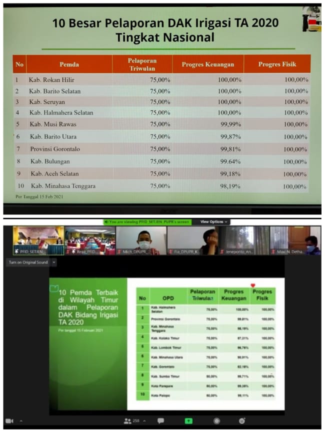 Berkomitmen memberikan pelaporan terbaik dalam bidang administrasi dan keuangan, maka tak heran daerah dengan slogan melaju 21 ini kembali menorehkan prestasi dengan menyabet peringkat 3 pemerintah daerah (Pemda) terbaik wilayah Indonesia Timur dalam pelaporan DAK bidang irigasi tahun 2020 dan peringkat 10 terbaik nasional.