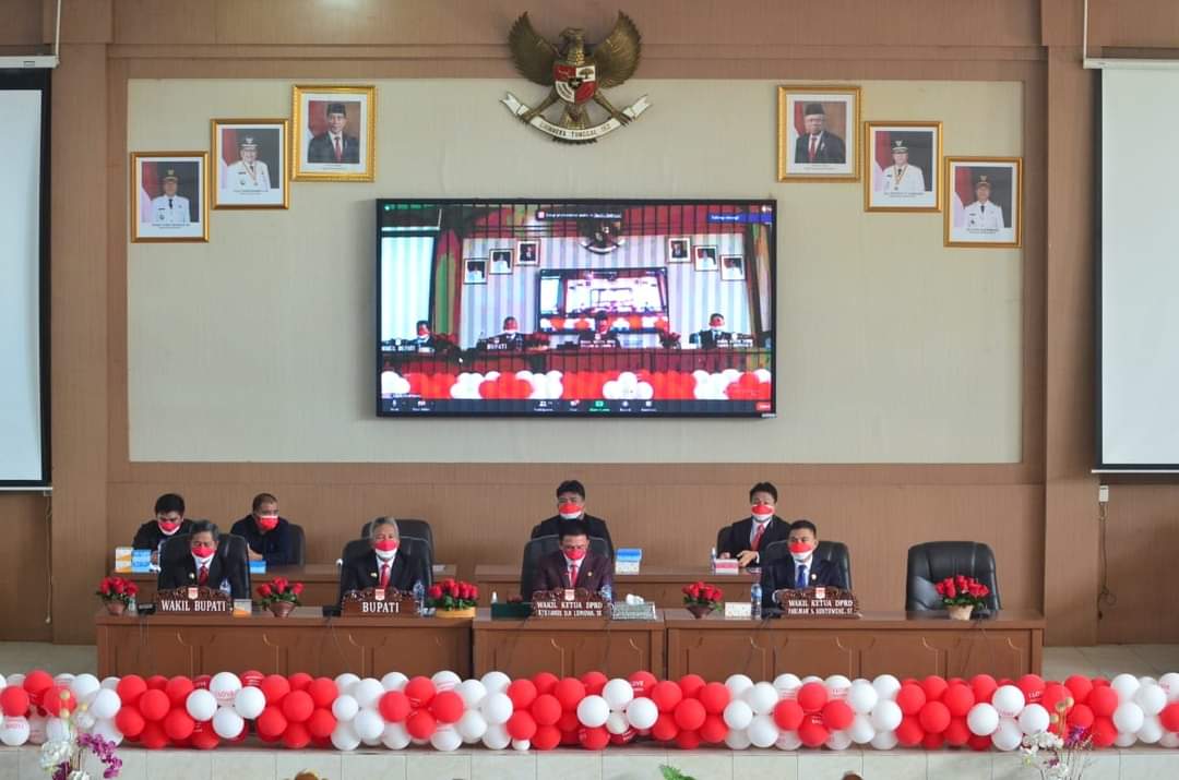 Dengan mengambil tema Indonesia tangguh, Indonesia tumbuh.Bupati dan Wabup beserta para peserta rapat paripurna mendengarkan pidato Presiden Republik Indonesia (RI) Joko Widodo, pada pembukaan sidang tahunan Majelis Permusyawaratan Rakyat (MPR) RI dan sidang bersama DPR RI tahun 2021.