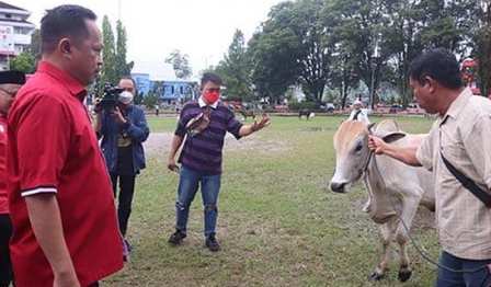Sebanyak 24 hewan kurban diserahkan secara simbolis oleh Wakil Walikota Richard Sualang kepada perwakilan 24 masjid di Lapangan Sparta Tikala, Jumat (08/07/2022) pagi.