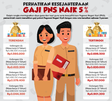 – Golongan I/a (masa kerja 0 tahun) : Rp1.486.500 naik menjadi Rp1.560.800