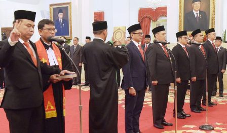 “Saya bersumpah/berjanji bahwa saya akan setia kepada Undang-Undang Dasar Negara Republik Indonesia tahun 1945 serta akan menjalankan segala peraturan perundang-undangan dengan selurus-lurusnya demi darmabakti saya kepada bangsa dan negara. Bahwa saya dalam menjalankan tugas jabatan akan menjunjung tinggi etika jabatan, bekerja dengan sebaik-baiknya, dengan penuh rasa tanggung jawab,” ucap Presiden mendiktekan sumpah jabatan.