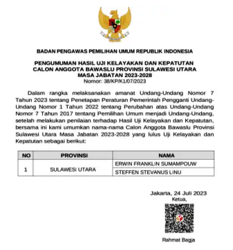 “Setelah melakukan penilaian terhadap hasil Uji Kelayakan dan Kepatutan, bersama ini kami umumkan nama-nama Calon Anggota Bawaslu Provinsi Sulawesi Utara Masa Jabatan 2023-2028 yang lulus Uji Kelayakan dan Kepatutan,” demikian bunyi pengumuman yang dilegalisir barcode tandatangan Ketua Bawaslu RI, Rahmat Bagja.