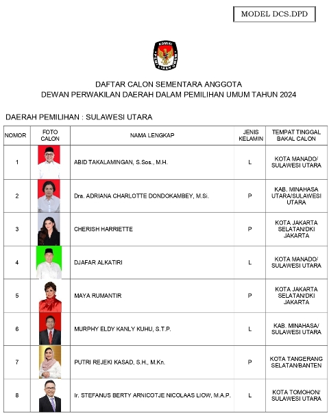 Berikut ini DCS Anggota Dewan Perwakilan Daerah (DPD) Provinsi Sulawesi Utara tertuang dalam surat Pengumuman Nomor 291/PL.01.4-Pu/71/2/2023.