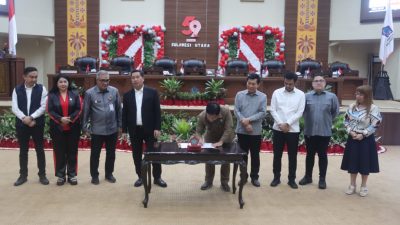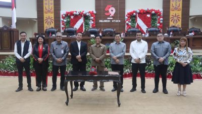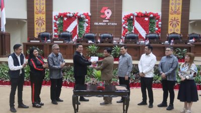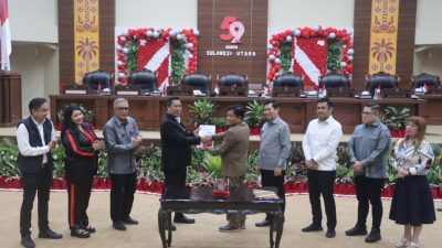 Manado, BERITASULUT.co.id – DPRD Provinsi Sulawesi Utara (Sulut) Menggelar Rapat Paripurna Penetapan Rancangan Peraturan Daerah (Ranperda) tentang Pajak dan Retribusi Daerah Provinsi Sulut menjadi Peraturan Daerah (Perda), di Ruang Paripurna Kantor DPRD Sulut, Manado, Selasa (5/12/2023).