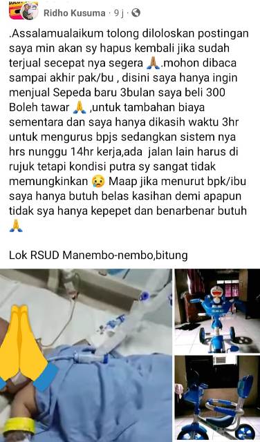 “Assalamualaikum tolong diloloskan postingan saya min akan saya hapus kembali jika sudah terjual secepatnya segera. Mohon dibaca sampai akhir pak/bu, di sini saya hanya ingin menjual sepeda baru 3 bulan saya beli 300 (Rp.300 ribu) boleh tawar, untuk tambahan biaya sementara dan saya hanya dikasih waktu 3 hari untuk mengurus BPJS (Kesehatan) sedangkan sistemnya harus menunggu 14 hari kerja. Ada jalan lain harus dirujuk tetapi kondisi putra saya sangat tidak memungkinkan. Maaf jika menurut bapak/ibu saya hanya butuh belas kasihan demi apapun tidak saya hanya kepepet dan benar-benar butuh”.
