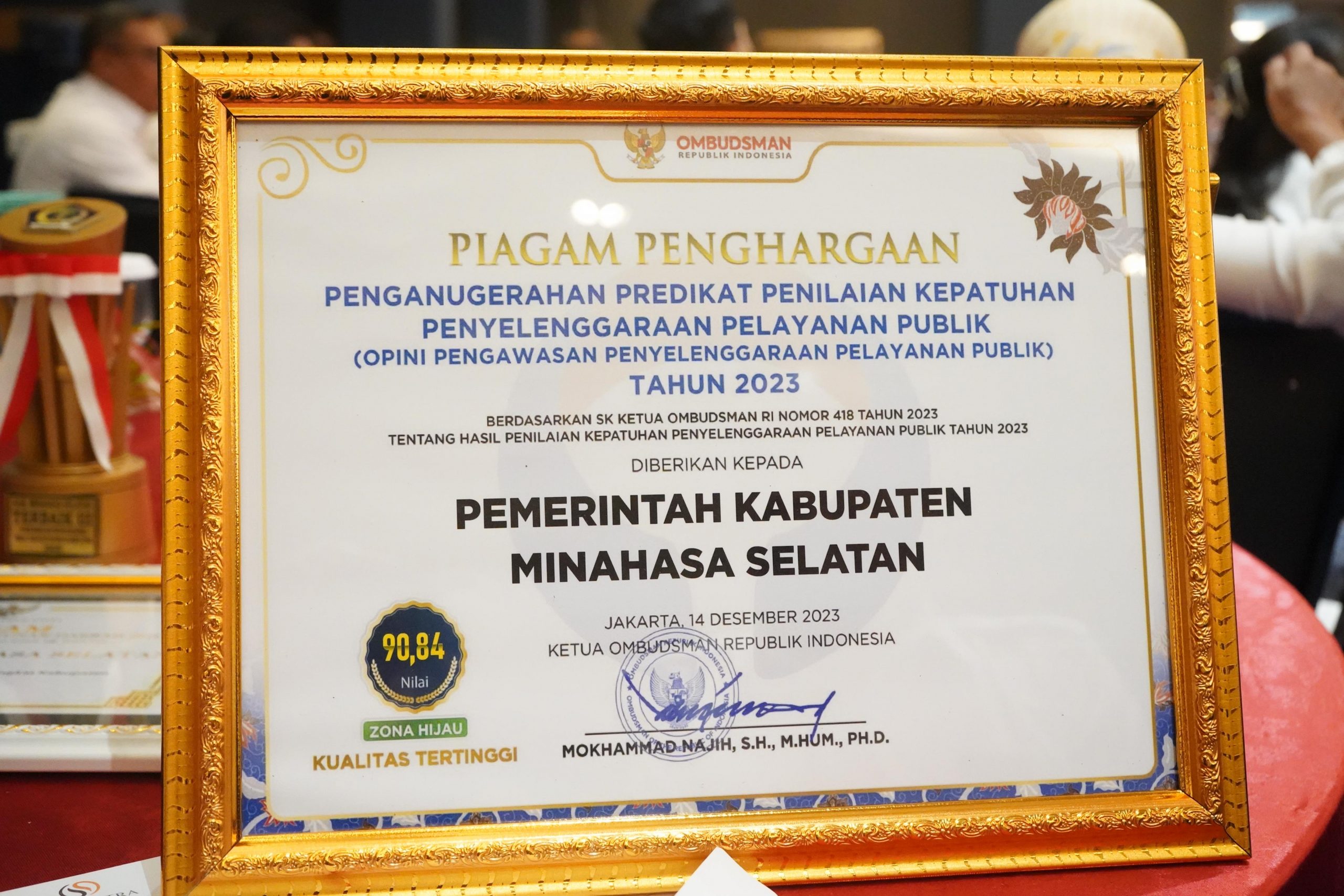 Keseriusan itu berbuah manis, pasalnya Rabu (24/4/2024) Bupati TDW menerima piagam penghargaan penganugerahan predikat kepatuhan penyelenggaraan pelayanan publik (Opini Pengawasan Penyelenggaraan Pelayanan Publik) Tahun 2023 peringkat Ke-6, dengan Nilai 90,84 (Zona Hijau) Kategori A (Kualitas Tertinggi) dari Ombudsman RI dan Kepala perwakilan Ombudsman RI Sulawesi Utara.