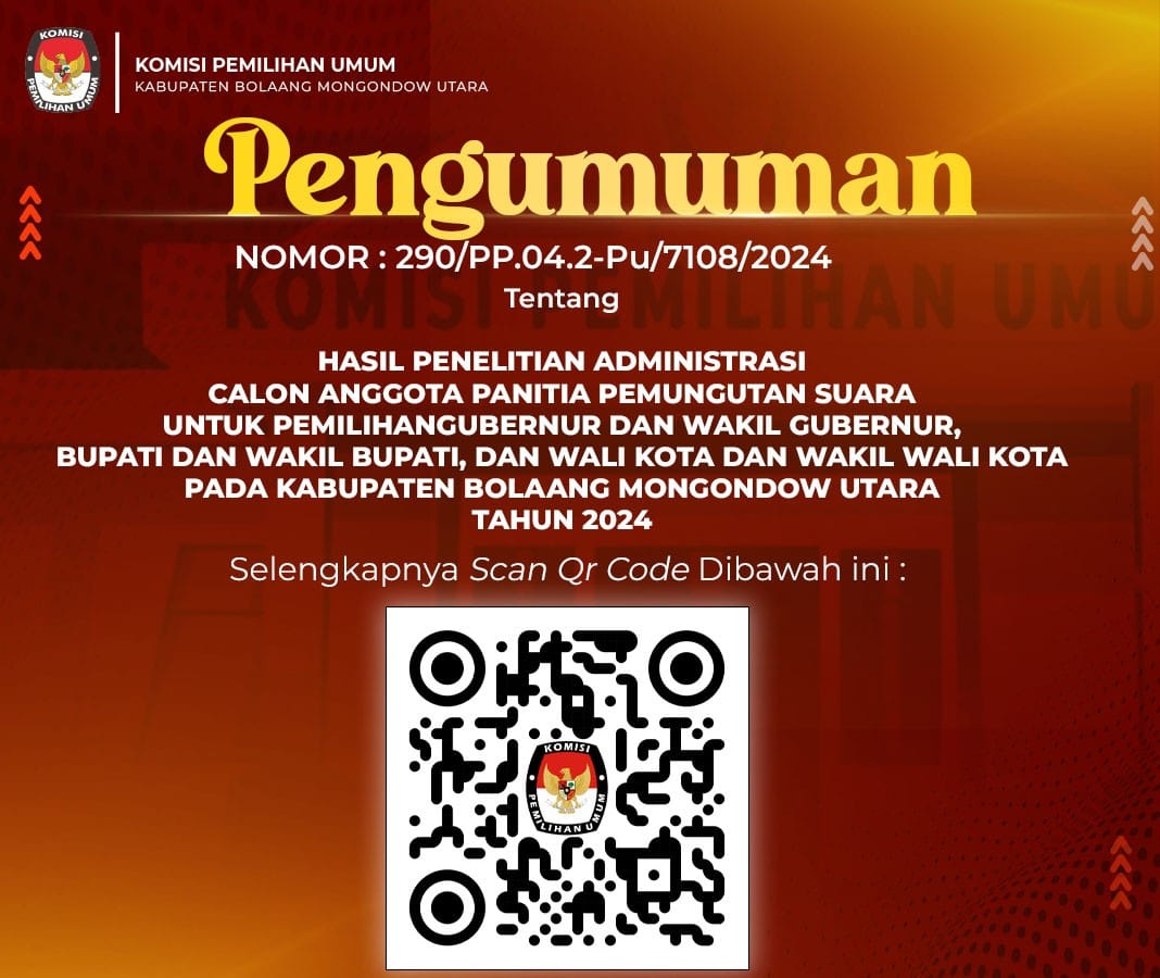 Bolmut, BERITASULUT.CO.ID – Komisi Pemilihan Umum (KPU) Kabupaten Bolaang Mongondow Utara (Bolmut) mengumumkan hasil penelitian administrasi calon anggota Panitia Pemungutan Suara (PPS) untuk pemilihan Gubernur dan wakil Gubernur, Bupati dan wakil Bupati, Walikota dan Wakil Walikota atau disebut Pilkada tahun 2024.