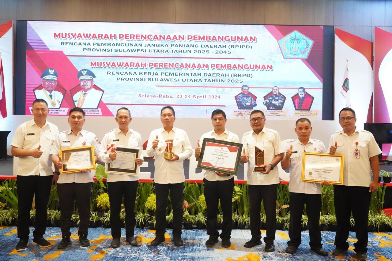 Penghargaan tersebut diserahkan pada pada kegiatan Musyawarah Perencanaan Pembangunan Rencana Pembangunan Jangka Panjang Daerah (RPJPD) Provinsi Sulut Tahun 2025-2045 dan Musyawarah Perencanaan Pembangunan Rencana Kerja Pemerintah Daerah (RKPD) Provinsi Sulawesi Utara Tahun 2025, di Hotel The Sentra Manado, Rabu 24 April 2024.