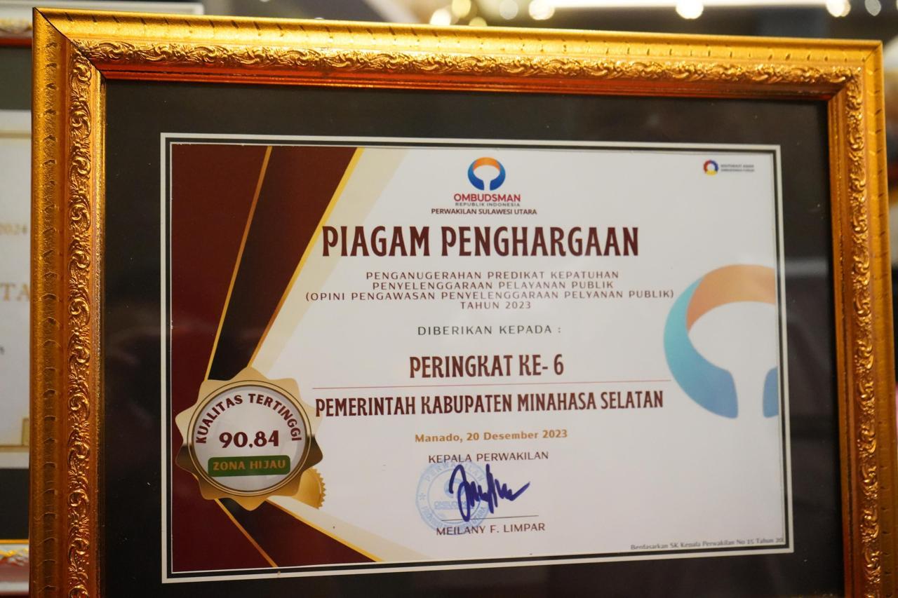 Bupati Franky Donny Wongkar SH menerima piagam penghargaan penganugerahan predikat kepatuhan penyelenggaraan pelayanan publik (Opini Pengawasan Penyelenggaraan Pelayanan Publik) Tahun 2023 Peringkat Ke-6, dengan Nilai 90,84 (Zona Hijau) Kategori A (Kualitas Tertinggi) dari Kepala Ombudsman RI dan Kepala Perwakilan Ombudsman RI Sulawesi Utara, yang diserahkan oleh Kepala Perwakilan Ombudsman RI Sulawesi Utara.