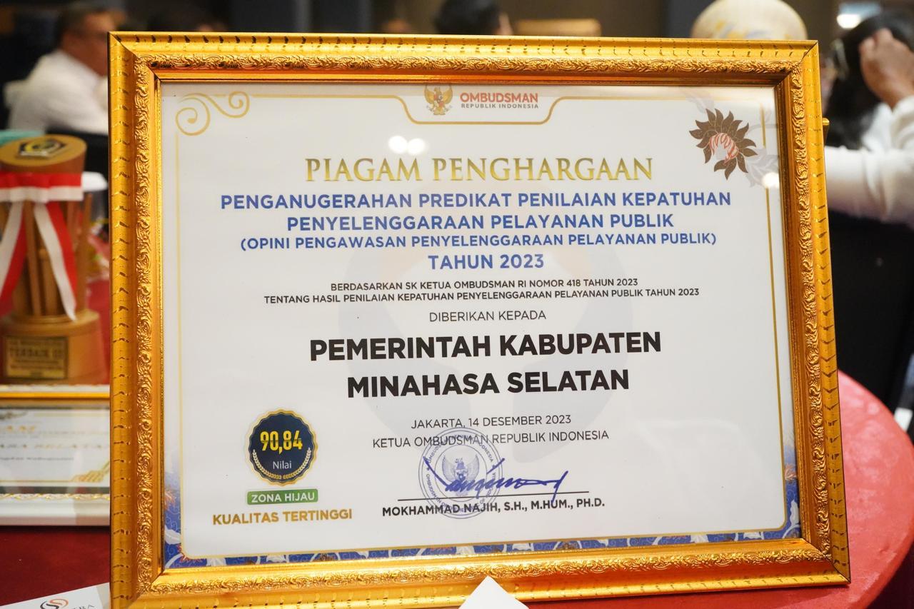 Perbaikan ini ditandai dengan keberhasilan Pemkab Minsel memperoleh kenaikan nilai kepatuhan penyelenggaraan pelayanan publik yang cukup signifikan dari Ombudsman RI, dari sebelumnya 63,78 zona kuning kategori C kualitas sedang di tahun 2022 naik menjadi 90,84 zona hijau kategori A kualitas tertinggi.