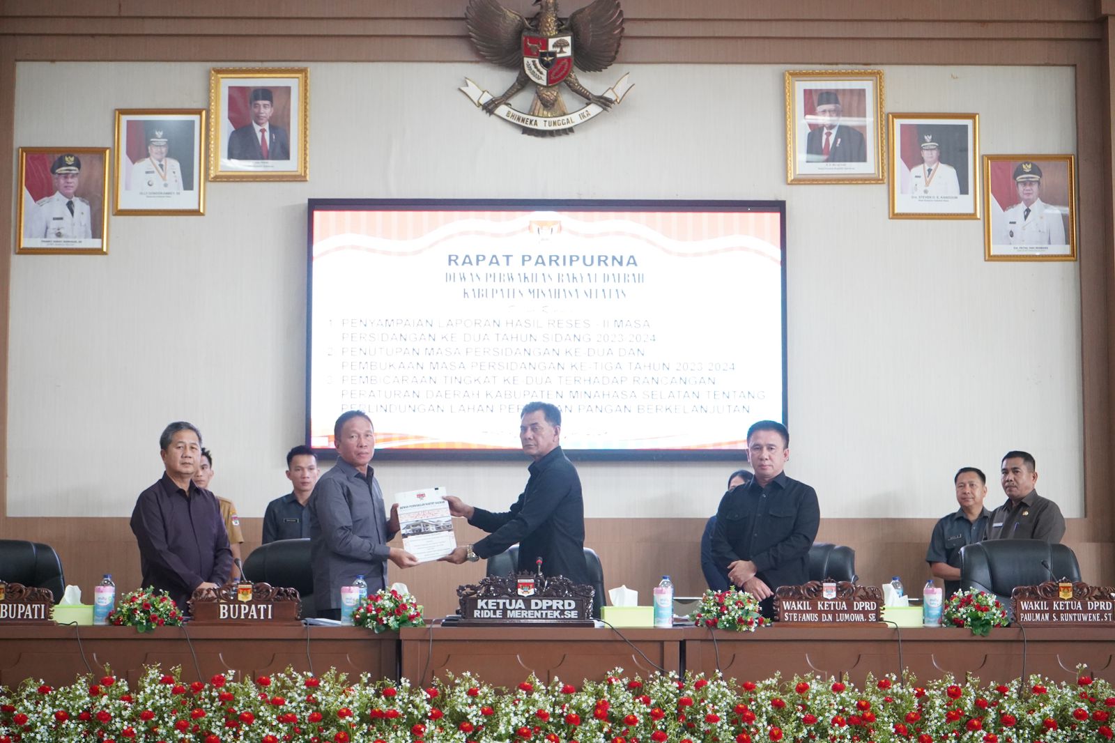 Dan pembicaraan tingkat kedua terhadap rancangan peraturan daerah tentang perlindungan lahan pertanian pangan berkelanjutan, di Ruang Rapat DPRD Minsel, Senin (3/62024).