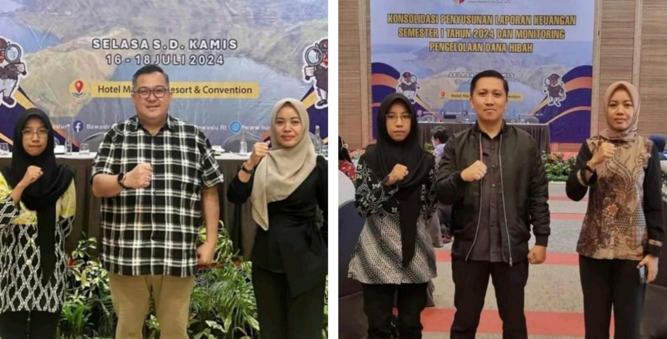 Anggota Bawaslu Sulut Erwin Sumampouw dan Kepala Sekretariat Aldrin Christian beserta Analis APBN-BPP Hibah Pilkada mengikuti kegiatan bertajuk Konsolidasi Penyusunan Laporan Keuangan Semester I Tahun 2024 dan Monitoring Pengelolaan Dana Hibah, yang digelar di Samosir, Sumatera Utara.