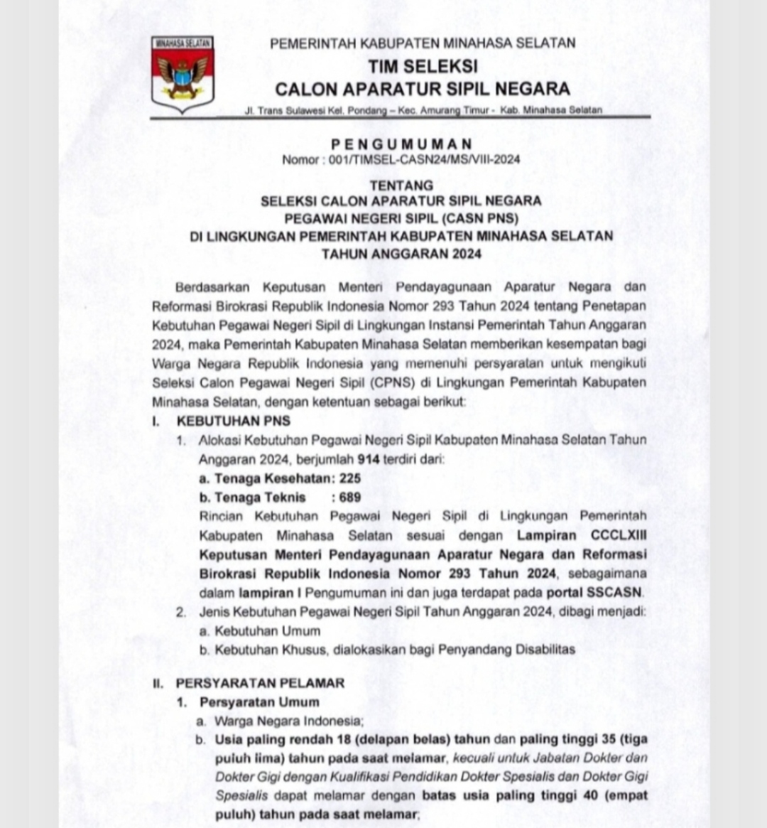 “Pemkab Minsel segera membuka pendaftaran Calon Pegawai Negeri Sipil (CPNS) 2024. Pengumuman pelaksanaan seleksi CPNS dilakukan mulai Senin (19/8/2024),” tutur Makaenas.