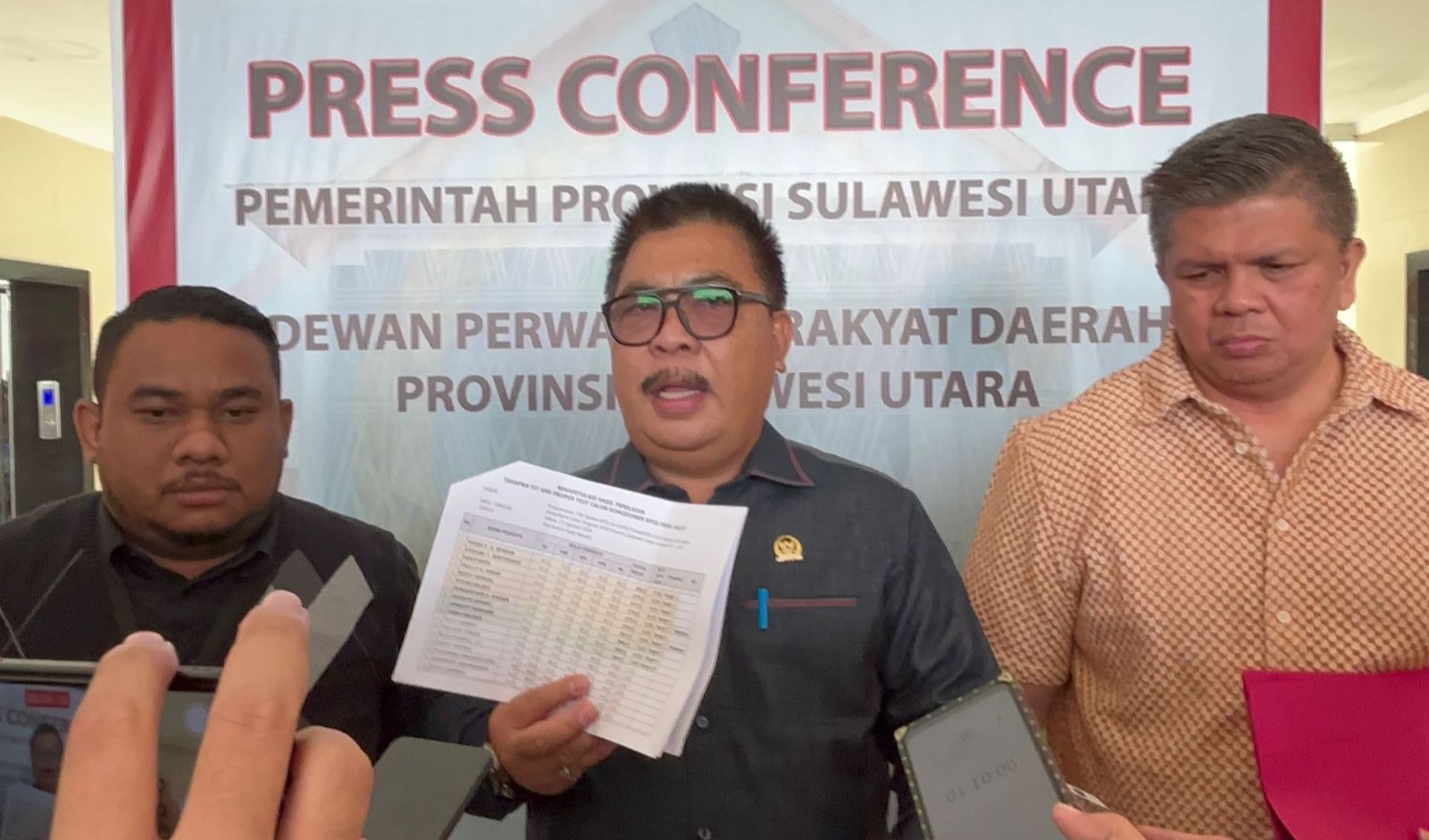Ketua Komisi I DPRD Sulut Fabian Kaloh didampingi Sekretaris Henry Walukow dan Anggota Hilman Idrus, saat memberi keterangan pers usai pleno penetapan calon KPID Sulut, Rabu (21/8/2024).