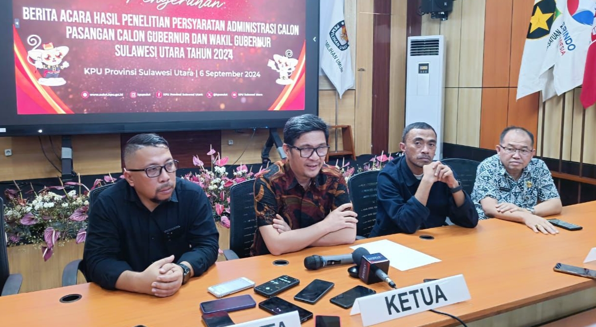 Hal ini disampaikan Ketua Komisi Pemilihan Umum (KPU) Provinsi Sulut Kenly Poluan, didampingi anggota Salman Saelangi dan Awaludin Umbola, dan Sekretaris Meidy Malonda, dalam konferensi pers, terkait hasil penelitian persyaratan administrasi calon Gubernur dan Wakil Gubernur Sulut di Kantor KPU Sulut, Jumat (6/9/2024).