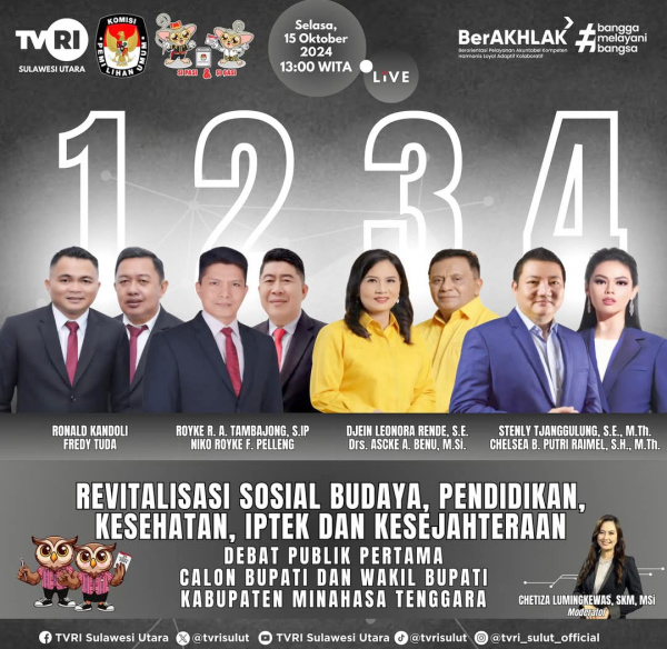 RATAHAN, BERITASULUT.co.id – Komisi Pemilihan Umum (KPU) Kabupaten Minahasa Tenggara (Mitra), menyelenggarakan debat publik pertama Pasangan Calon Bupati dan Wakil Bupati, pada Selasa (15/10/2024).