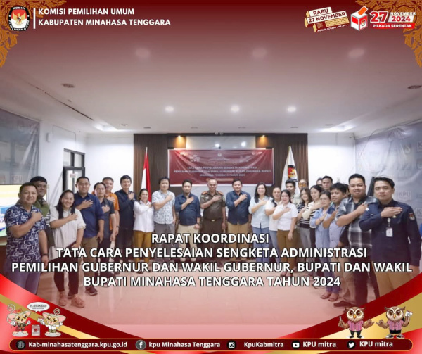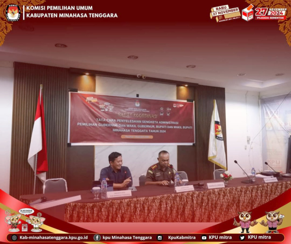 RATAHAN, BERITASULUT.co.id – Komisi Pemilihan Umum (KPU) Kabupaten Minahasa Tenggara (Mitra), melaksanakan rapat koordinasi (Rakor) untuk membahas tata cara penyelesaian sengketa administrasi pada Pemilihan Gubernur dan Wakil Gubernur serta Bupati dan Wakil Bupati tahun 2024.
