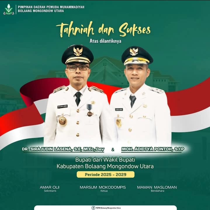 Bolmut, BERITASULUT.CO.ID – Pimpinan Daerah Pemuda Muhammadiyah (PDPM) Bolaang Mongondow Utara (Bolmut) menyampaikan ucapan selamat dan sukses atas pelantikan Dr. Sirajudin Lasena, S.E., M.Ec., Dev., dan Moh. Aditya Pontoh, S.I.P., sebagai Bupati dan Wakil Bupati Bolmut periode 2025-2029.