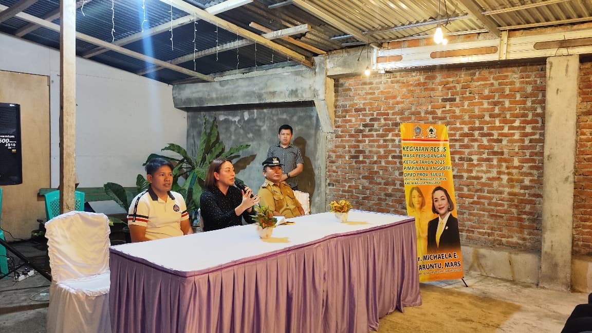 Manado,BERITASULUT.CO.ID-Wakil Ketua DPRD Sulut Michaela E Paruntu melaksanakan masa Reses II Tahun 2025, di Daerah Pemilihan (Dapil) Kabupaten Minahasa Selatan (Minsel) dan Kabupaten Minahasa Tenggara (Mitra), di mulai dari 30 Agustus-6 September 2025.