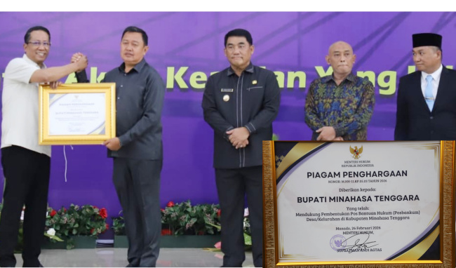 Penghargaan ini diserahkan langsung Menteri Hukum RI, Supratman Andi Agtas, dan diterima Wakil Bupati Fredy Tuda, Kamis (26/2/2026) di Graha Gubernuran Bumi Beringin, Manado, dengan disaksikan Gubernur Sulawesi Utara, Mayjen TNI (Purn) Yulius Selvanus.